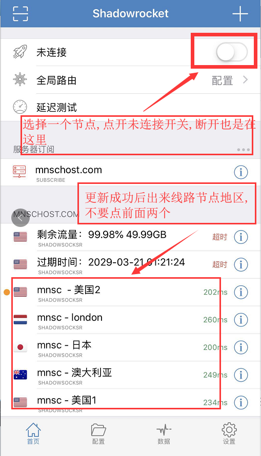 PS:请不要选前面的"剩余流量" "过期时间"这两个线路,这两个是没网络的,给你看状态的.