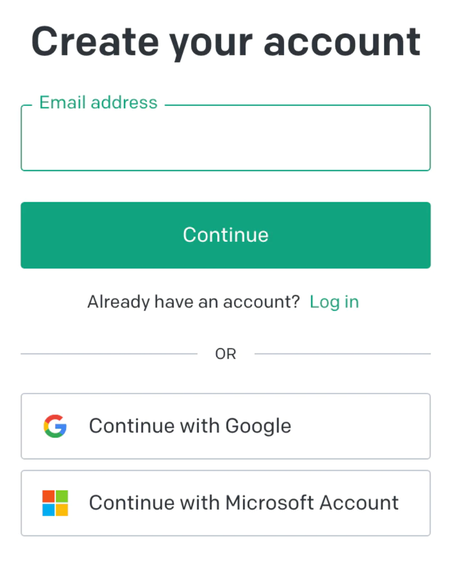 首先是打开ChatGPT的账户注册页面。谷歌注册或者邮箱注册都可以,无所谓,这里用谷歌邮箱注册作为例子。
