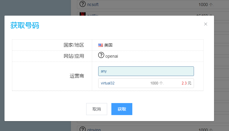 然后到我们的接码网站上去。在左侧选择美国,然后应用里选择OpenAi。