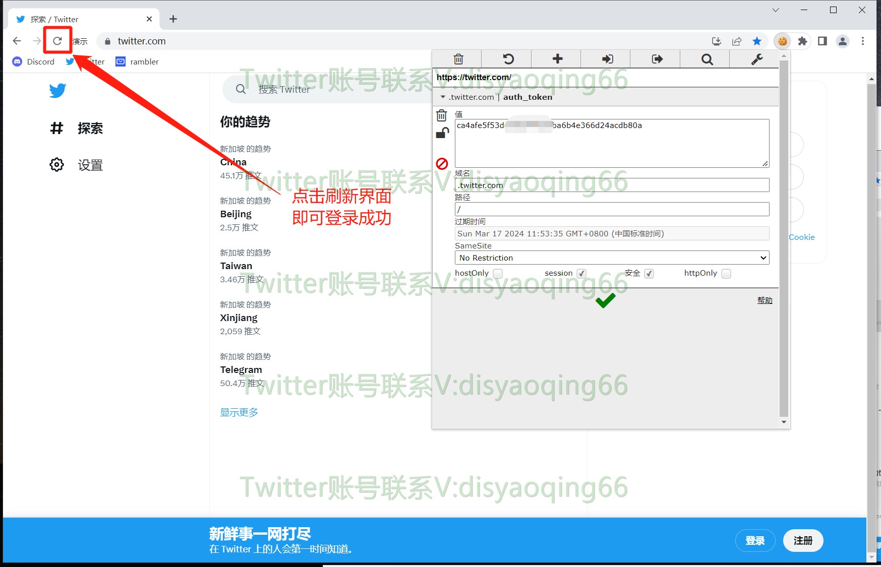 步骤四:点击刷新(按F5),刷新网页即可完成使用Token登录Twitter